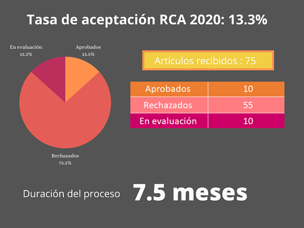 Los manuscritos se someten al proceso editorial de la RCA, que contempla dos fases: una de evaluación (9 meses de duración aproximada) y otra de publicación (que demora al menos 3 meses). Esto supone que entre la recepción del manuscrito y su publicación transcurren por lo menos 12 meses.